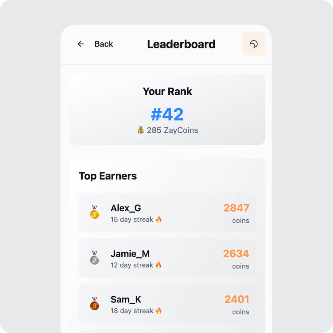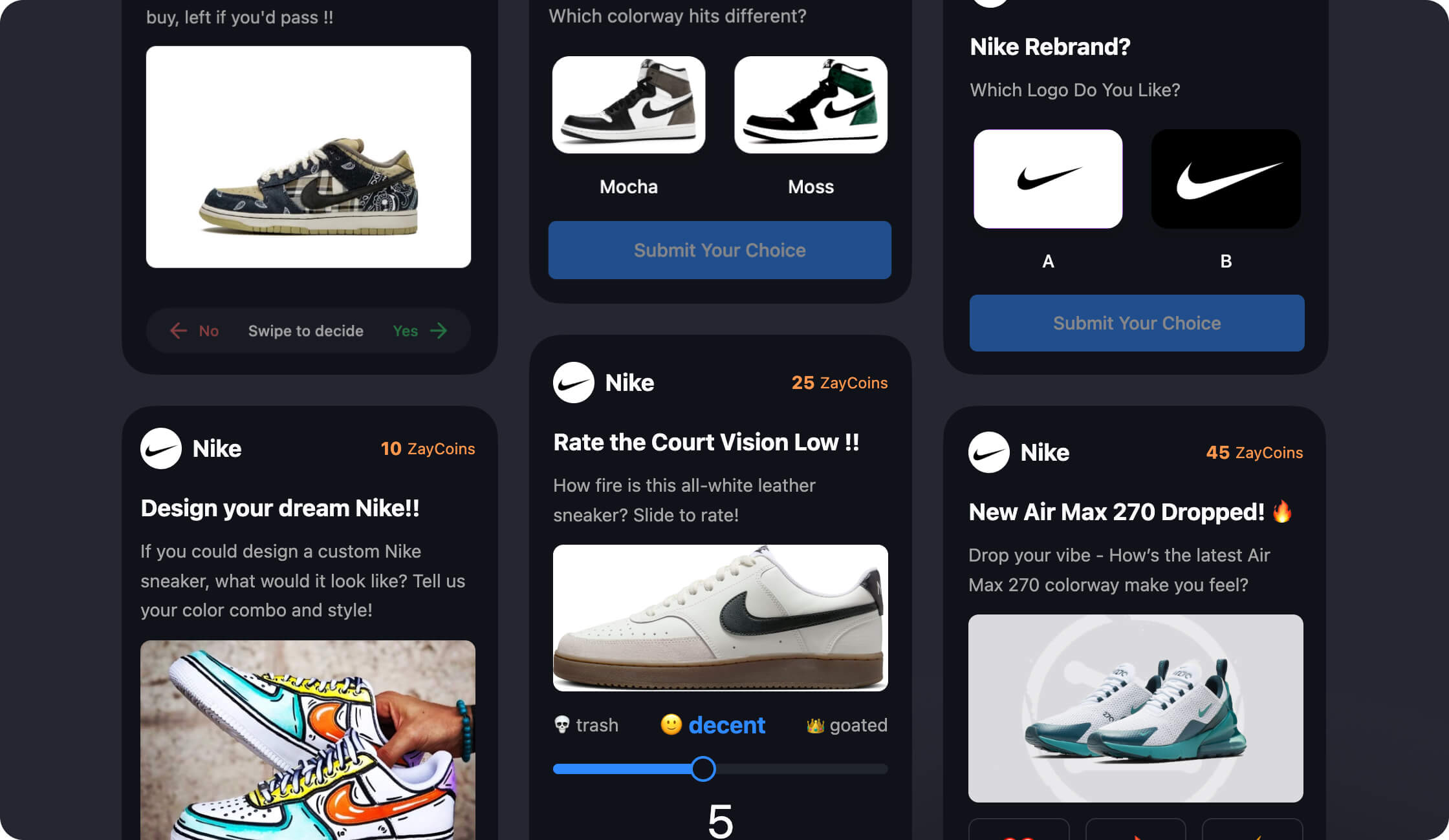 We partnered with Zay to build a gamified feedback platform that turns Gen Z reactions into real-time brand insights, complete with rewards, streaks, leaderboards, and a social wallet experience.