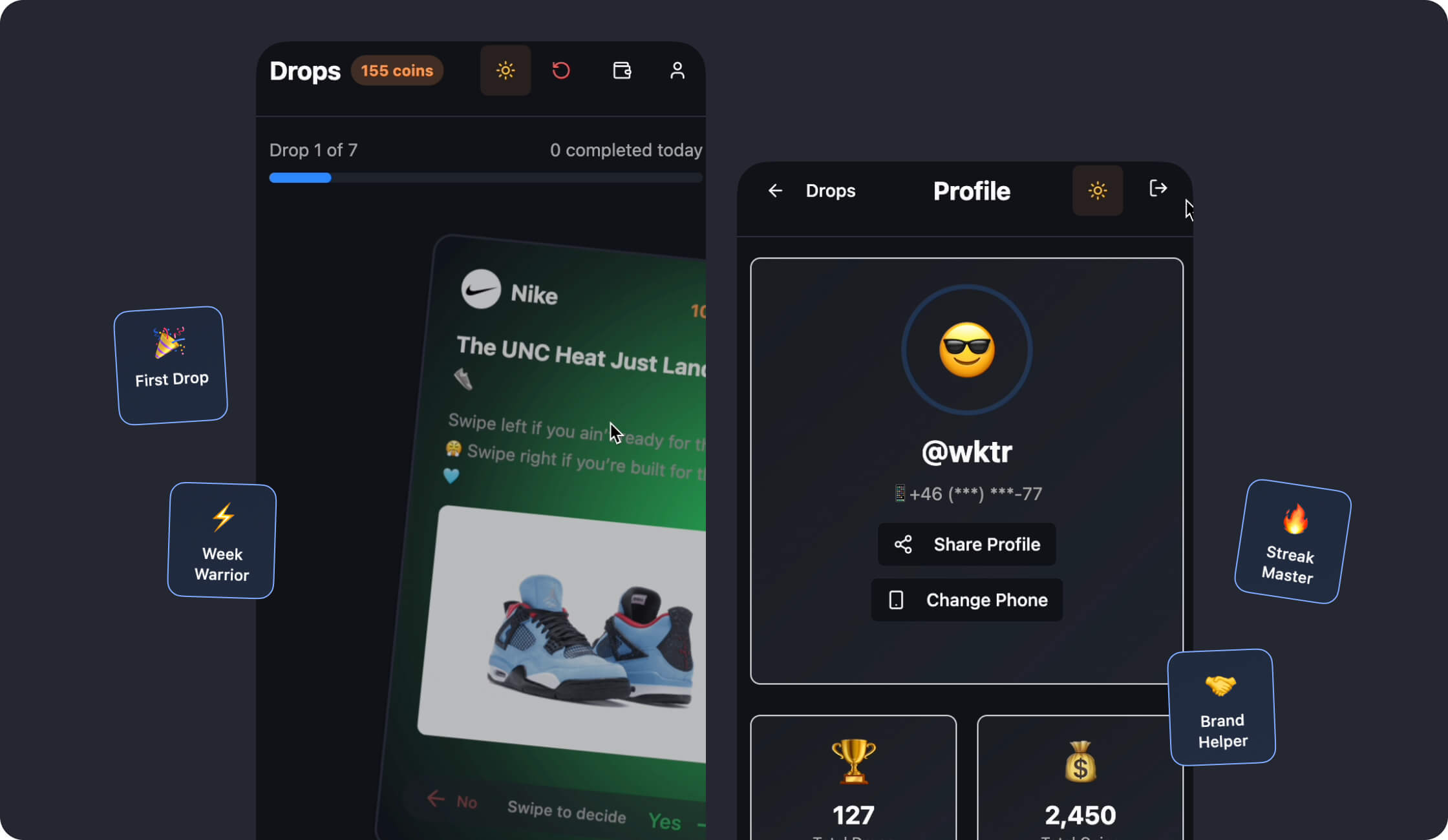 The platform had to balance two distinct journeys: a highly gamified consumer experience and a structured, professional brand interface. For users, the feed needed to feel fast and addictive with swipeable cards, emoji reactions, instant coin rewards, and a wallet that anchors streaks, community, and cash-out options. The cash-out flow also required clarity and trust while remaining lightweight enough for MVP. For brands, the challenge was designing a simple campaign wizard, targeting filters, and visual insight summaries that updated as users reacted. Coordinating both sides into a seamless demonstration path. Creating a drop, showing it in the app, capturing a reaction, and surface insights was essential.