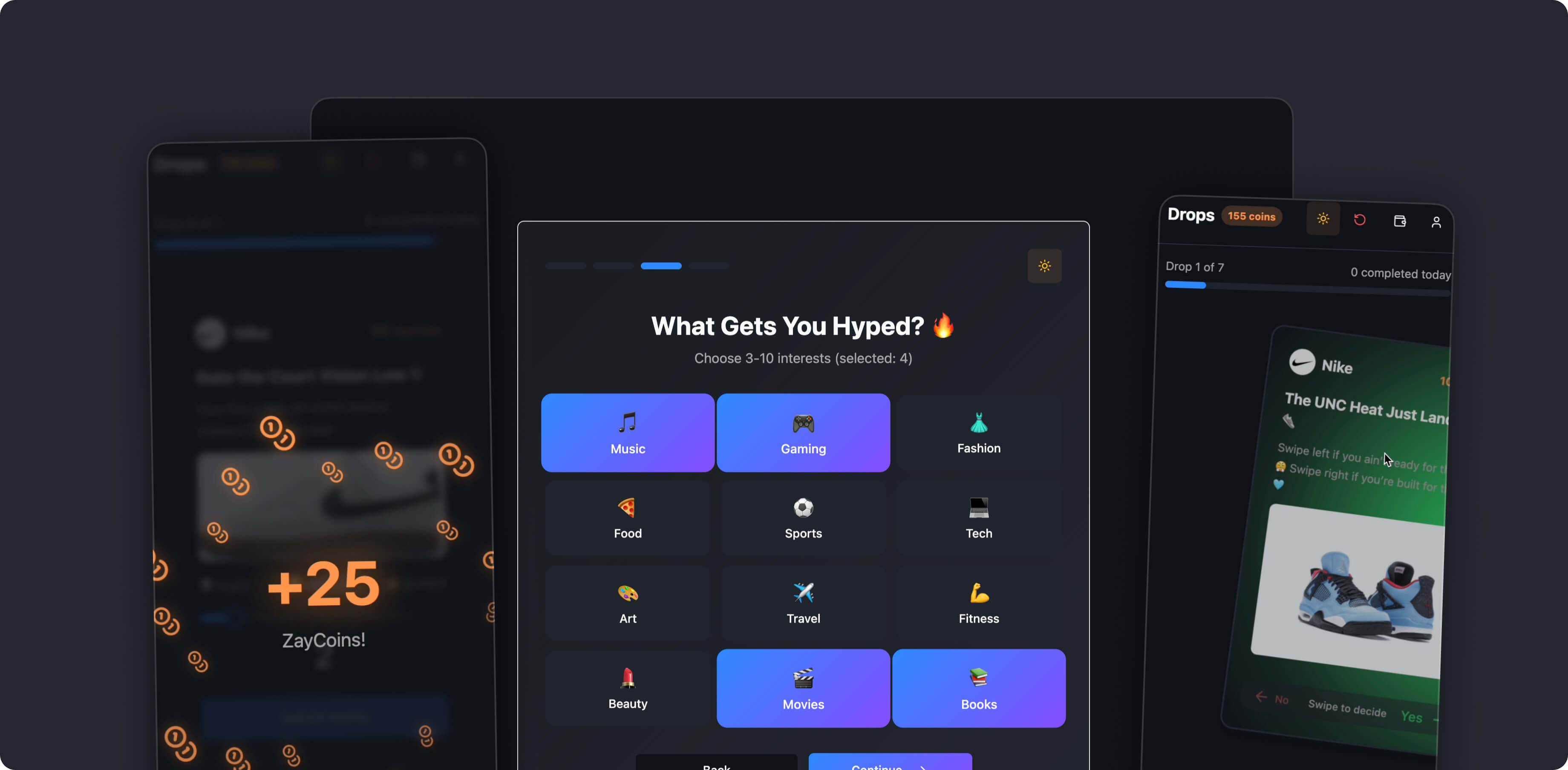 The final MVP provides a complete loop that showcases Zay’s value to both users and brands. Gen Z users can onboard, swipe through drops, earn coins, track streaks, and explore a wallet that makes rewards feel tangible. Brands can launch drops through a guided creation flow and view real-time reactions, sentiment summaries, and demographic insights in a clean dashboard. The wallet includes a motivating cash-out journey with PayPal or gift-card options, supported by a simple backend process for early payouts. Together, these pieces create a cohesive, engaging system that validates Zay’s core thesis: Gen Z opinions have currency, and Zay turns them into action.